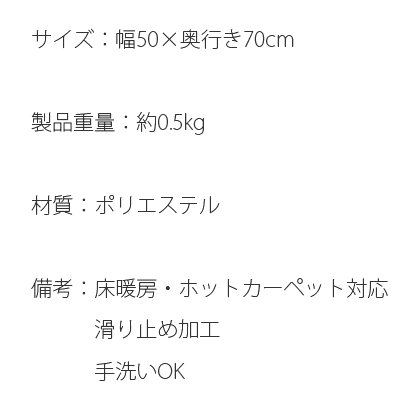 サイズ:幅50×奥行き70cm 製品重量:約0.5kg 材質:ポリエステル 備考:床暖房・ホットカーペット対応、滑り止め加工、手洗いOK ※床暖房よっては、ラグ等敷物の使用が不可の場合がございます。