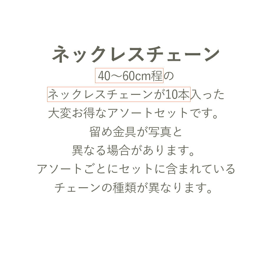 【楽天ランキング1位入賞】商品名称:ネックレスチェーン 種類:アソートセット 材料:真鍮 鉄 丹銅 入数:10本 サイズ:約40cm〜60cm 色:ゴールド ロジウムカラー アンティークゴールド アンティークシルバー 形: 検索キーワード: ネックレスチェーン、アソートセット、真鍮 鉄 丹銅、10本、約40cm〜60cm、ゴールド ロジウムカラー アンティークゴールド アンティークシルバー、金系 銀系 金古美 シルバー、パーツ、アクセサリー、ハンドメイド、手芸、手作り、材料、素材、ネックレス、金具、鎖、 ※画像はイメージです。